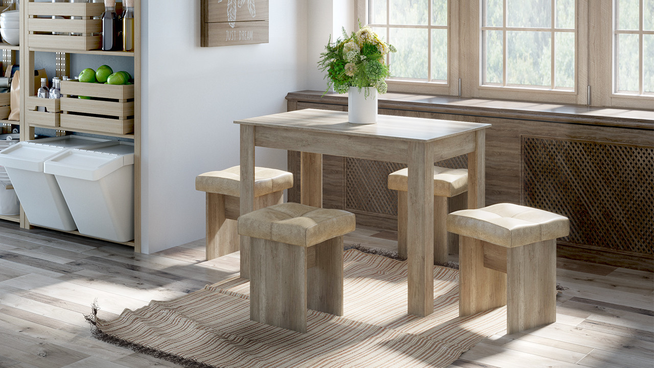 • Обеденная зона "Мадрид №1" состоит из удобной угловой скамьи, практичного стола и компактных табуретов.