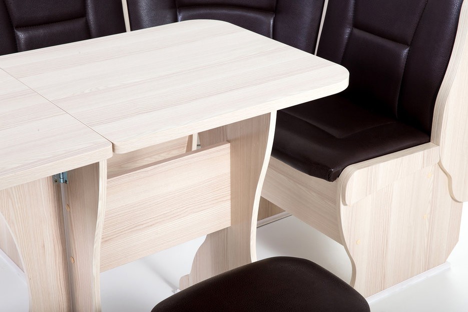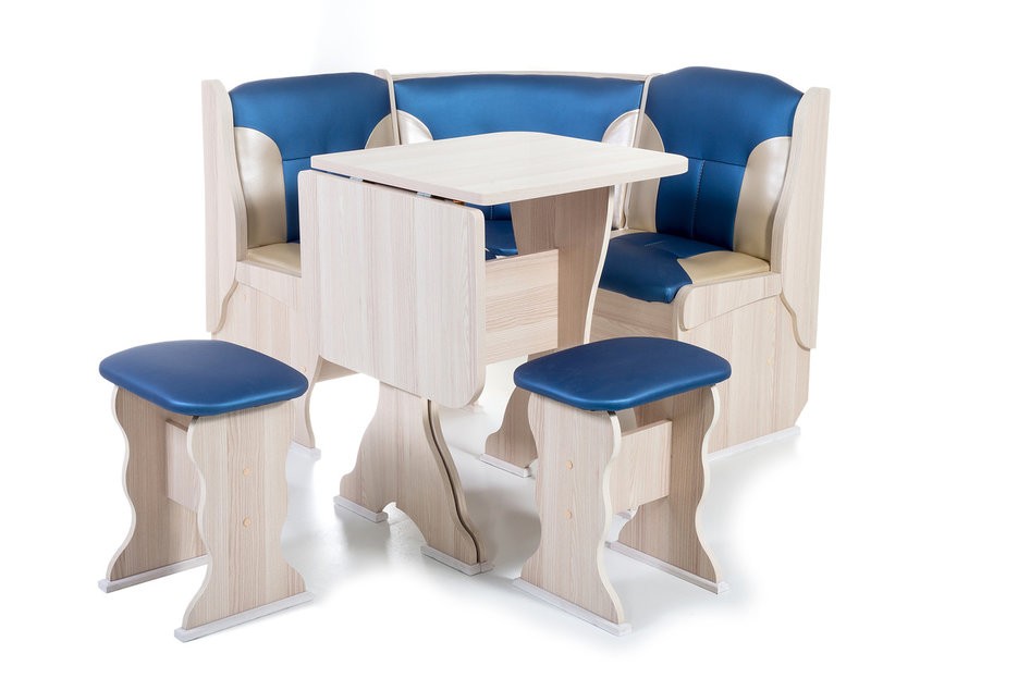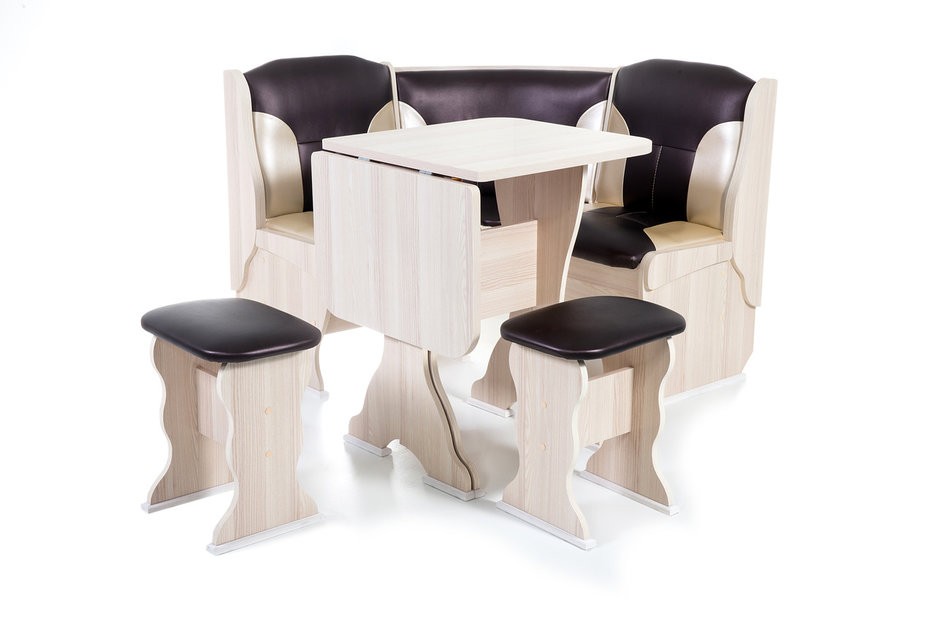 Особенности уголка: Поможет обустроить комфортную обеденную зону без лишних затрат. В гарнитур входит угловой диван, два табурета и раскладной стол. В угловой части дивана есть удобная полочка, на которую можно поставить нужные вещи. Под сидениями находятся вместительные ящики для хранения. Имеет термостойкую пластиковую столешницу. Угол собирается как в правом, так и в левом исполнении. Размеры: Размер угловой скамьи: ш(1080х1080)хг530хв880 мм. Размер стола: ш625(1000)хг580хв750 мм. Размер табурета: ш380хг300хв450 мм. Высота уголка: 880 мм. Высота посадки скамьи: 465 мм. Высота табурета: 450 мм. Высота стола: 750 мм.