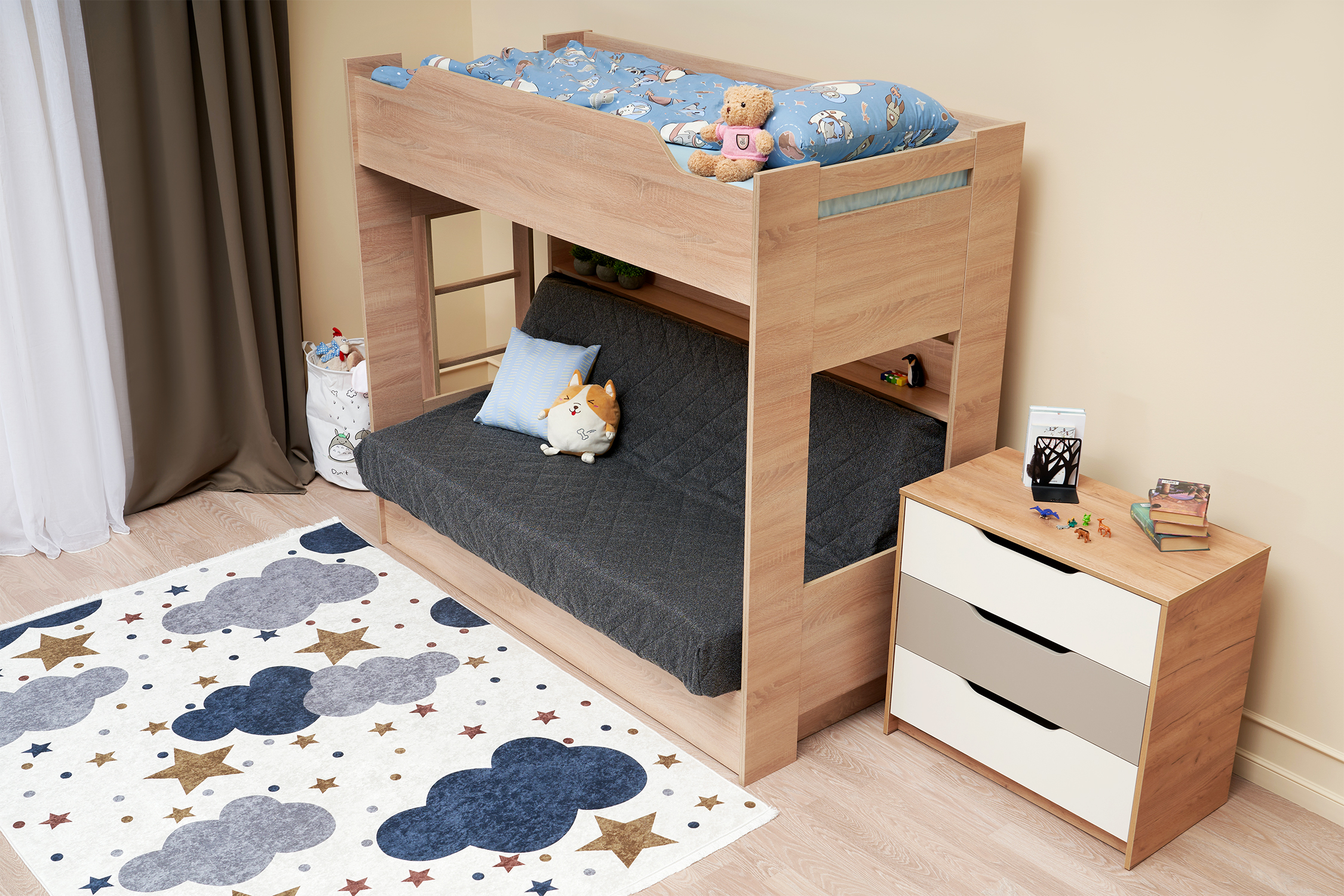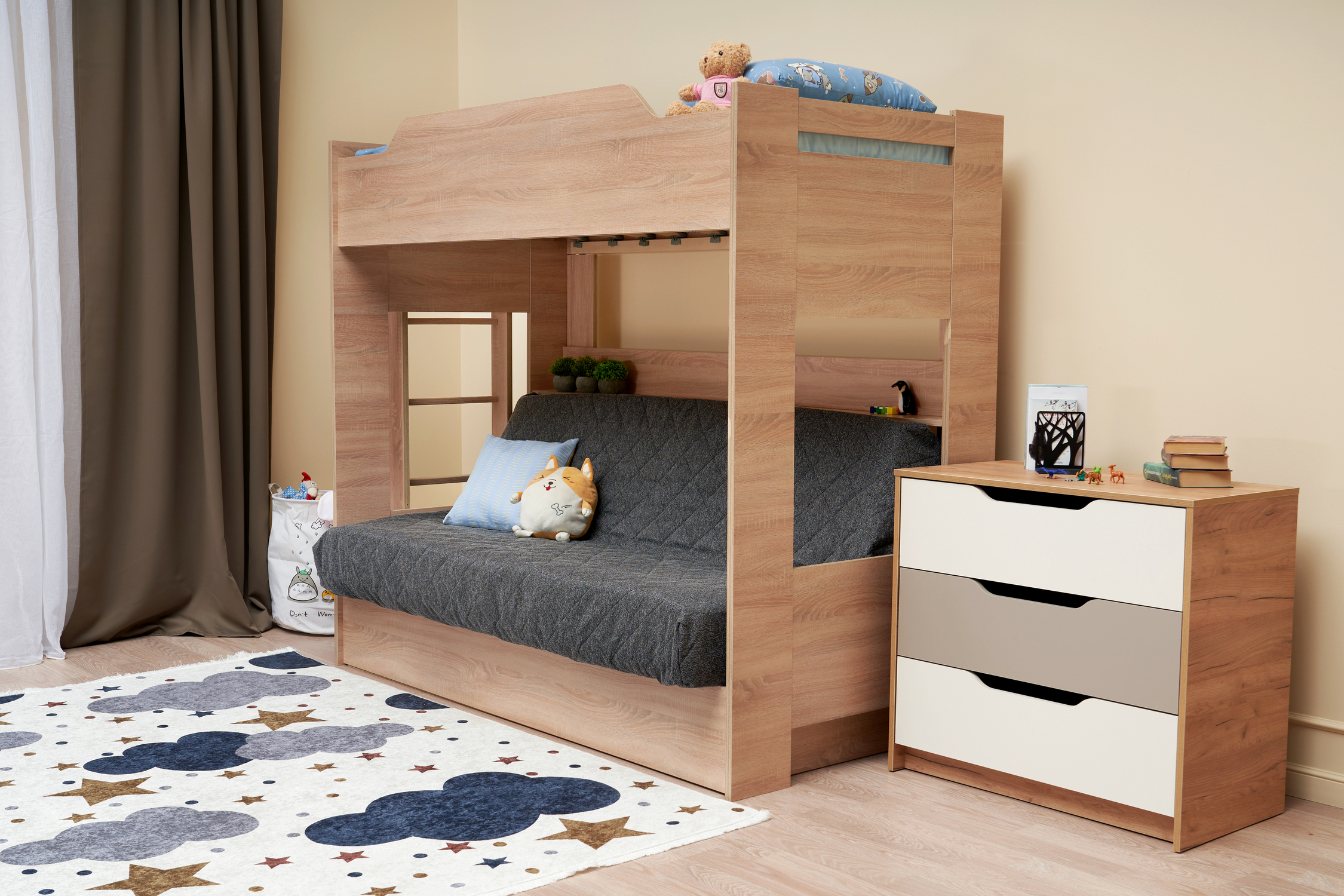 Механизм трансформации дивана: «Книжка». Рекомендуемая высота матраса на верхний ярус 17 см. Максимальная нагрузка на верхний ярус 50 кг. Лестница может быть установлена с обеих сторон кровати. Высота бортика 30 см. Максимальная нагрузка на нижний ярус 90 кг. Чехол съемный.