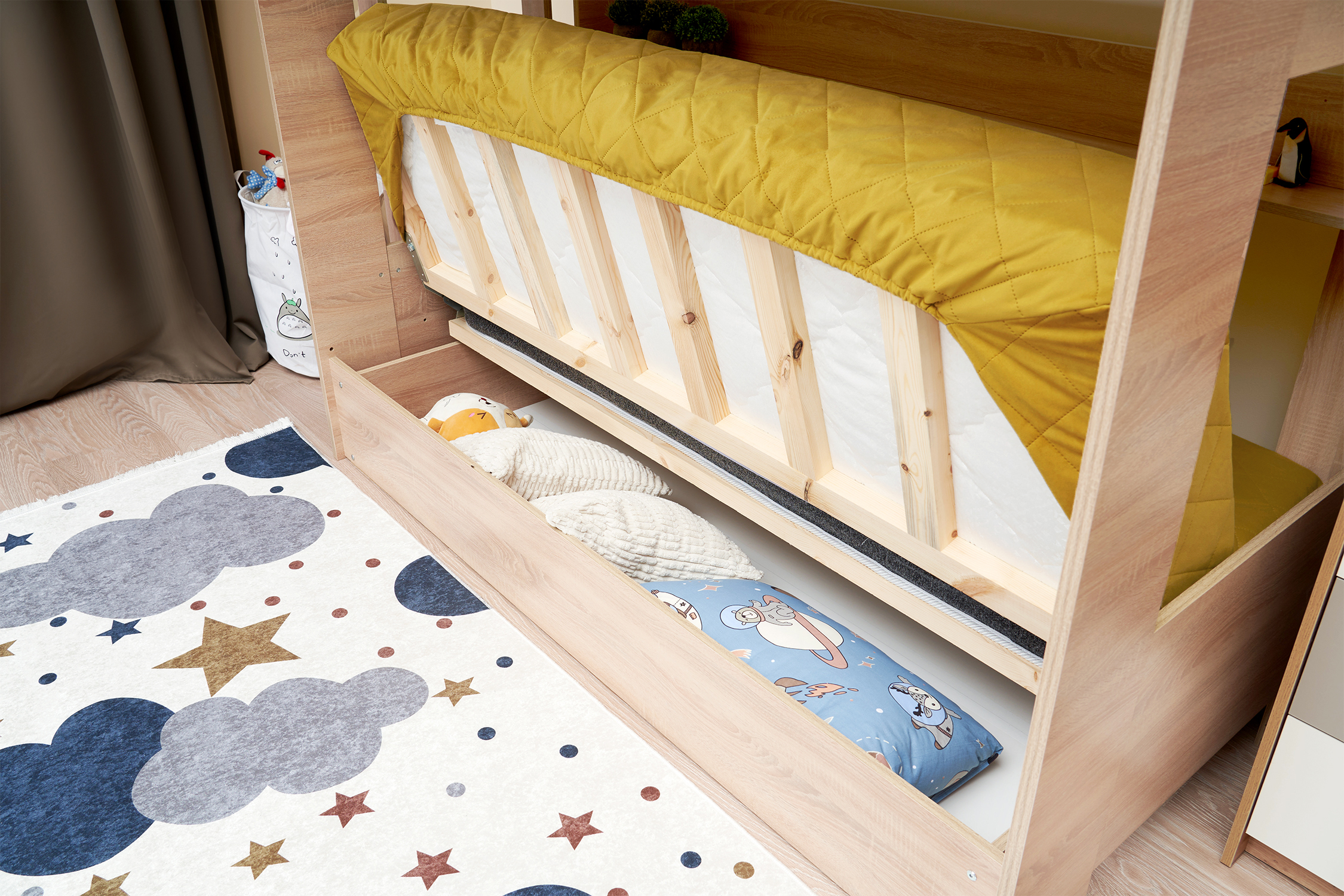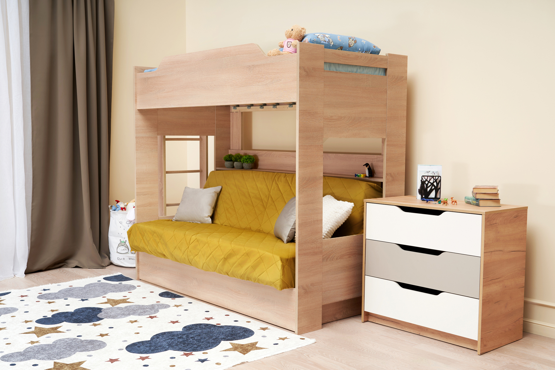 Механизм трансформации дивана: «Книжка». Рекомендуемая высота матраса на верхний ярус 17 см. Максимальная нагрузка на верхний ярус 50 кг. Лестница может быть установлена с обеих сторон кровати. Высота бортика 30 см. Максимальная нагрузка на нижний ярус 90 кг. Чехол съемный.