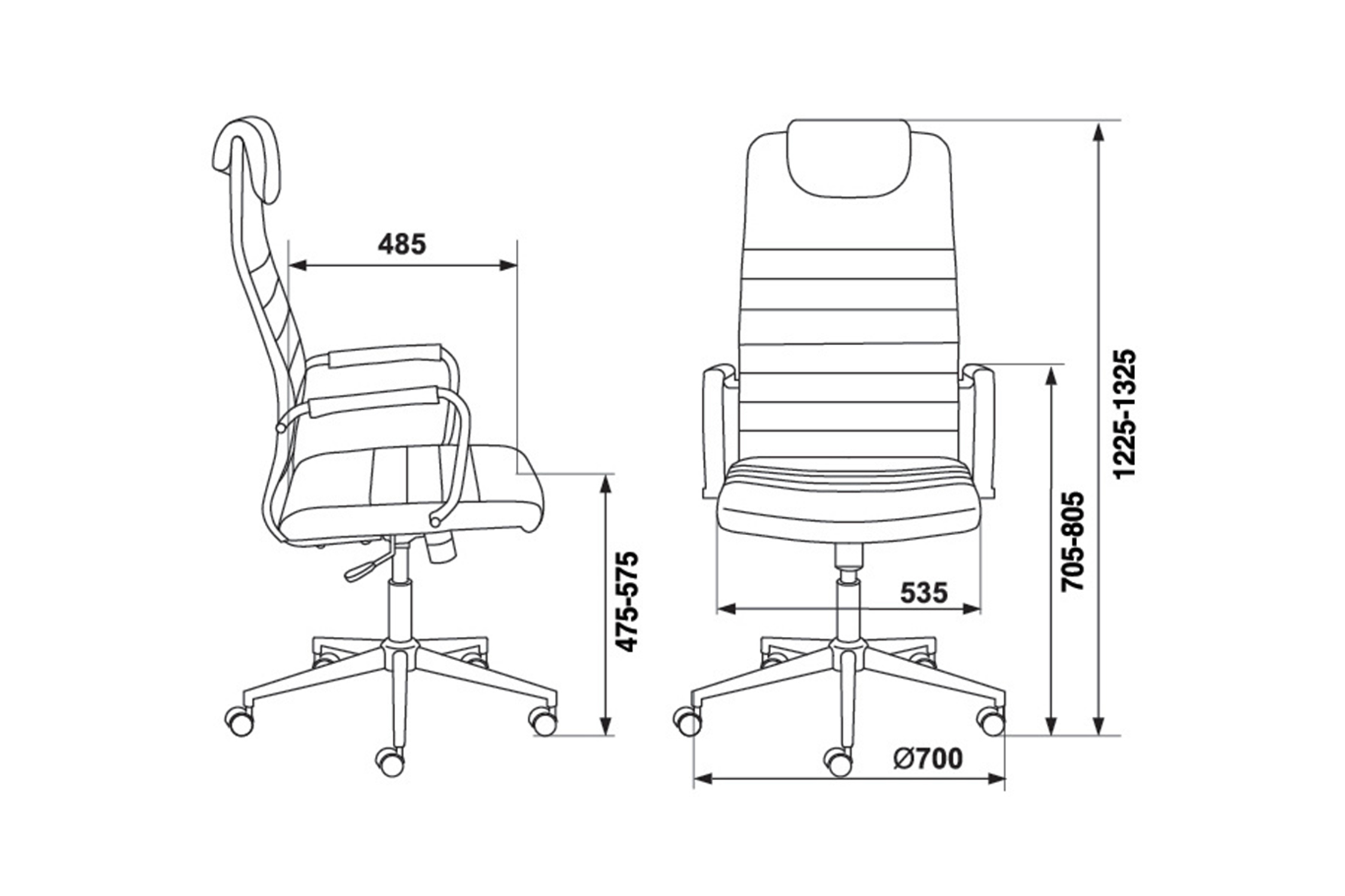 Диаметр колес - 5 см. Высота сиденья - 57.5 см. Высота с подлокотниками - 80.5 см. Ширина сиденья - 53.5 см. Глубина сиденья - 48.5 см. Материал колес - с накладкой PU. Механизм качания с регулировкой под вес и фиксацией в вертикальном положении. Подлокотники металлические хромированные с накладками из искусственной кожи. Крестовина - хромированная